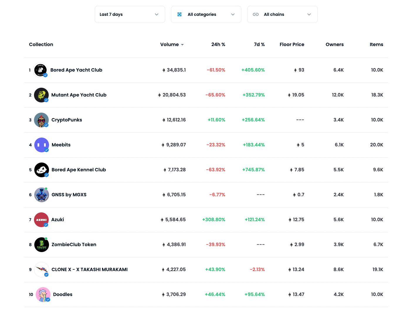 It comes as no surprise to anyone who’s been paying attention this week that most of the action in NFT land has come from Yuga Labs this week. BAYC, MAYC, and BAKC make up three of the top five slots, with CryptoPunks and Meebits (the IP of which Yuga acquired last week) filling in the other two.