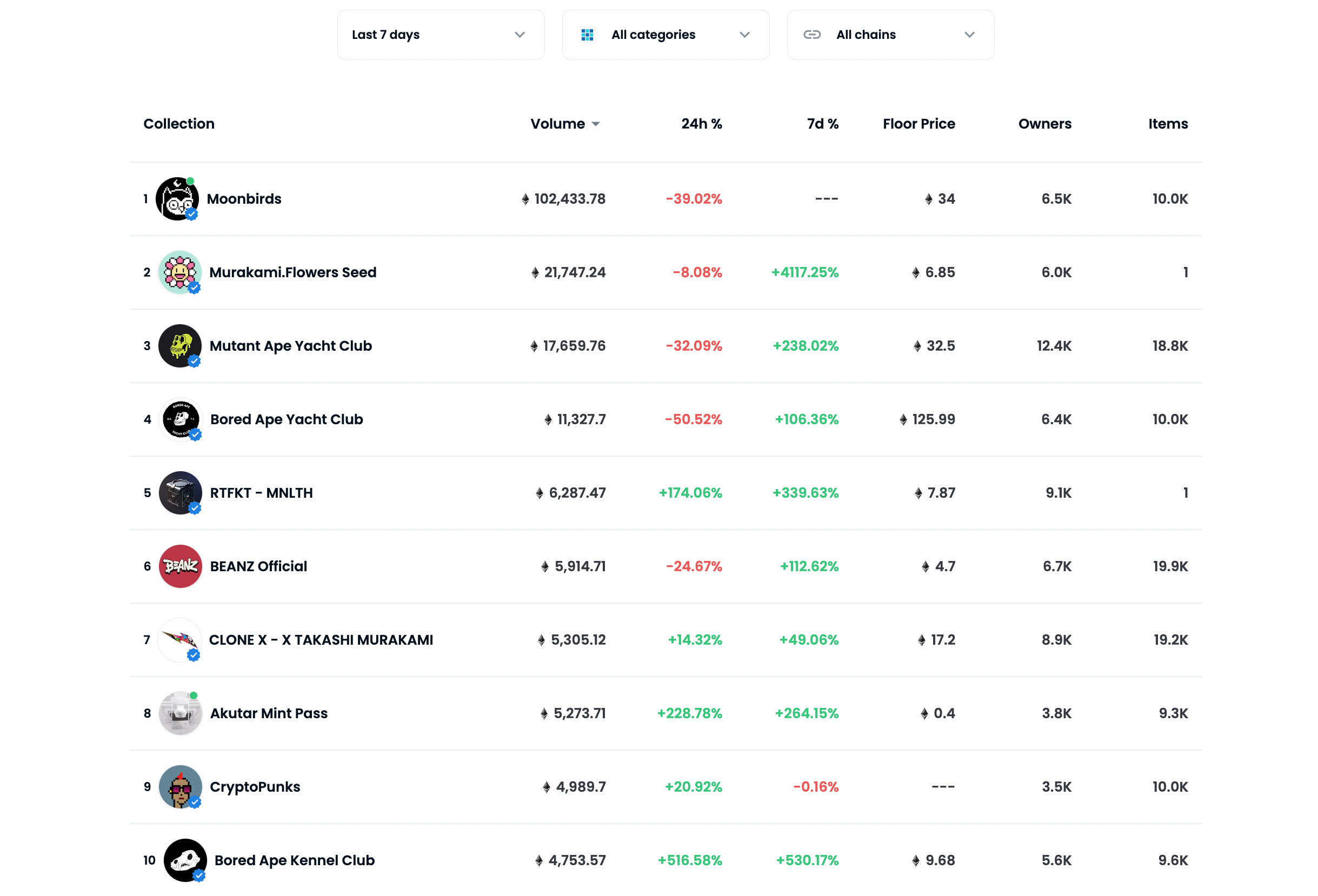 You get no points at all for guessing which NFT project has dominated this week’s charts (and newsletters). So the actual news lies elsewhere. Despite a lukewarm response from some collectors, Azuki’s Beanz have put in a solid showing, and the hype around Murakami Flowers has translated into plenty of trading volume.