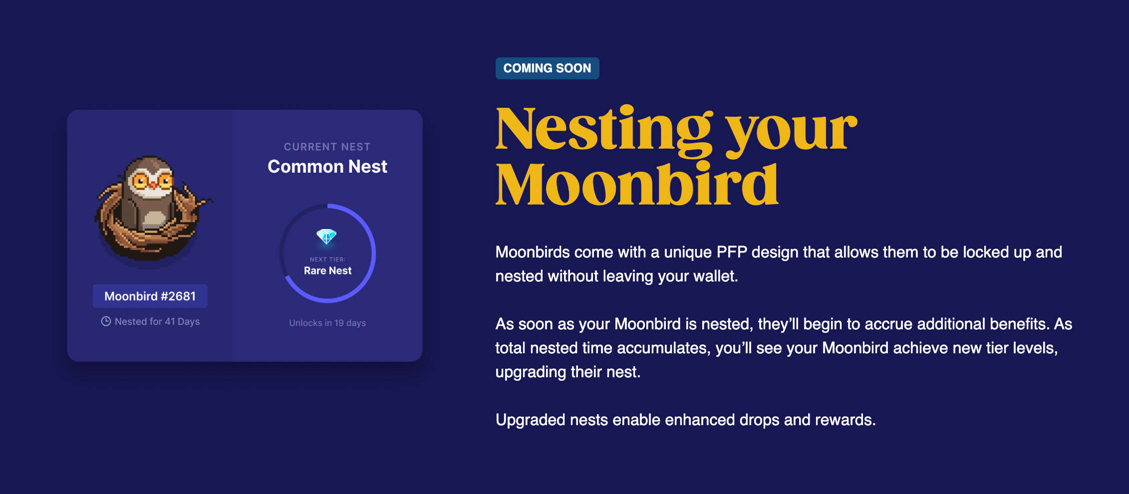 In addition to getting access to the Proof community, Moonbirds holders can look forward to real-world events, access to Proof’s next NFT projects (like its forthcoming metaverse, Project Highrise) and if they’re willing to lock up their Moonbird via a process called “nesting,” they’ll unlock additional yet-to-be-confirmed rewards. That could reduce the number of Moonbirds on the market, potentially driving the value even higher.