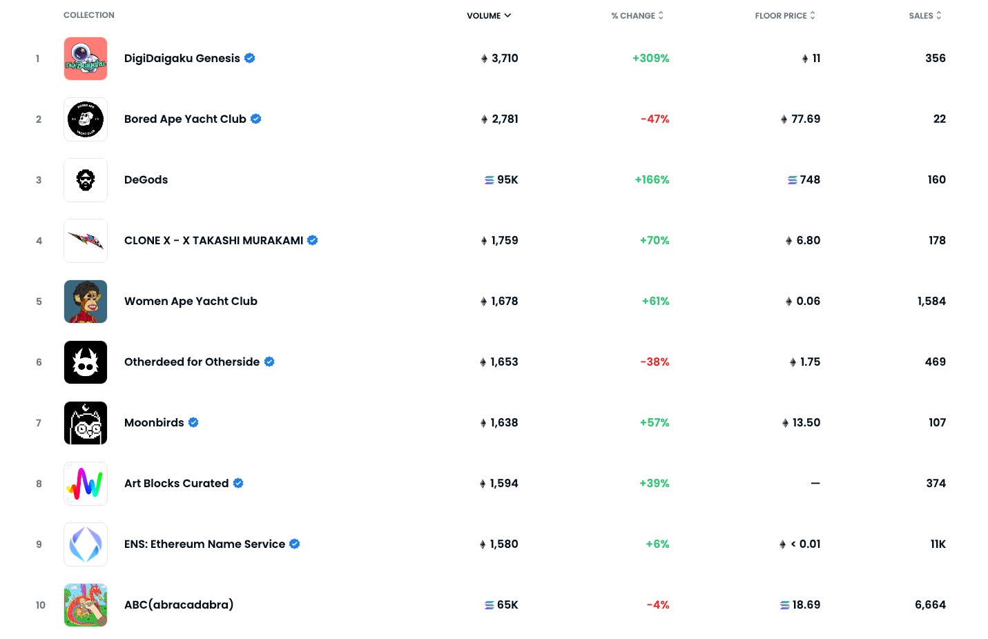 We’ve already covered DeGods and RTFKT/Clone X’s killer weeks, so the real news here is DidiDaigaku Genesis and its wild 11 ETH (~$17,400) floor price. You’d be forgiven for responding, “Eh?” So here’s the lowdown: Limit Break is a new blockchain game from free-to-play gaming pioneer Gabe Leydon. For the full rundown on his background and how he hopes to make “free-to-own” NFT games big business, check out this deep dive into his past and his ambitions for the future.