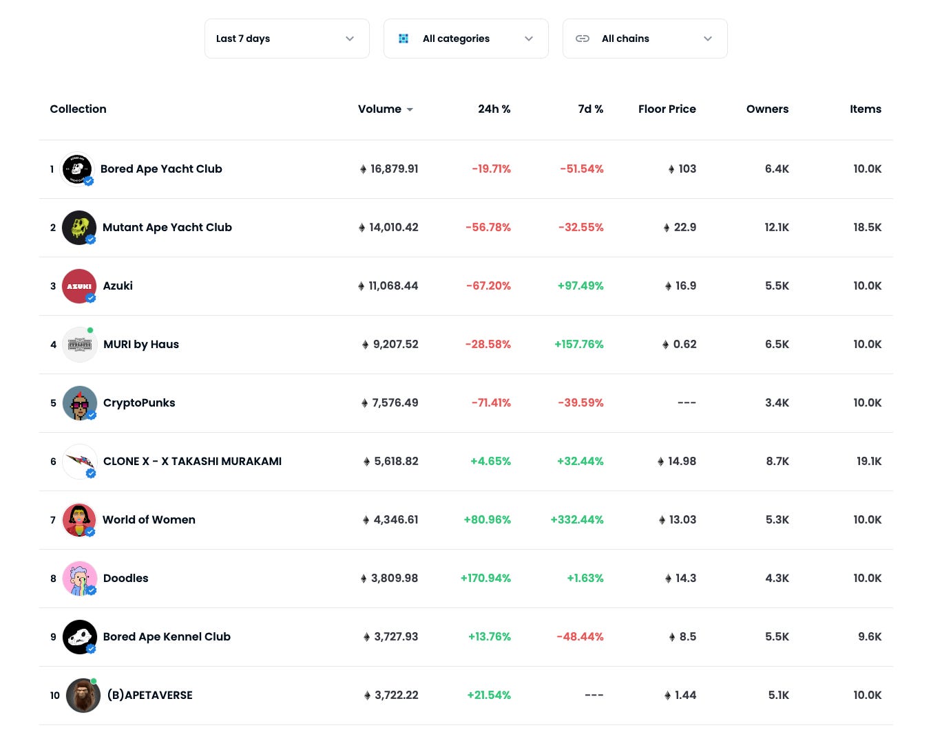 Apes continued to hold the top two spots this week, but Cryptopunks dropped two positions, knocked from last week’s third-place spot by Azuki and MURI by Haus. Azuki’s been on a tear in recent weeks, smashing through the psychologically important 10 ETH floor and continuing to climb, so much so that it’s now closing in on 20 ETH.