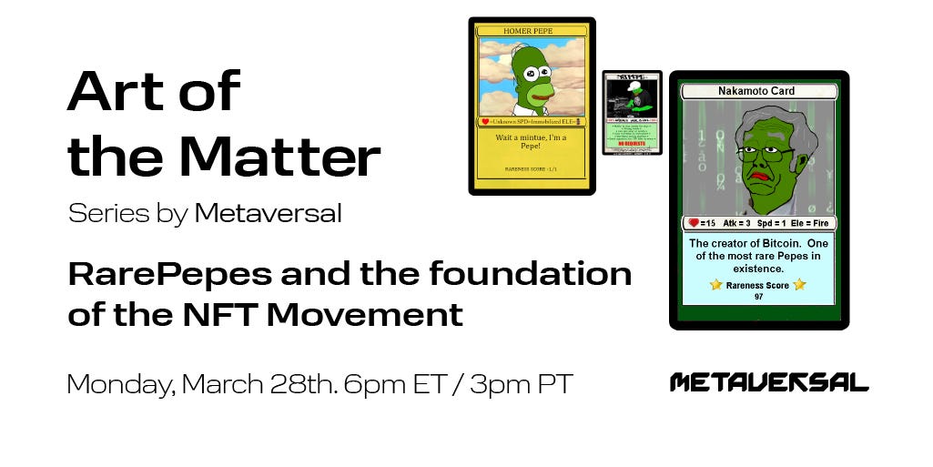 This time around hosts Jessica Angel and Craig Wilson will be joined by two NFT heavy-hitters and bonafide OGs: Joe Looney and RareScrilla. They’ll be talking about RarePepes, the early days of NFTs, how the NFT space has changed, and so much more. You can set a reminder via the tweet below: